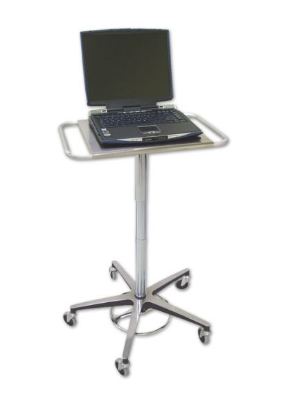 Features: Tray features dual handles for transport and height adjustment. Foot pedal adjusts surface height from 36″ to 46″. Heavy 5-leg base for stability. 3″ rubber wheel casters provide smooth and quiet transport. Dual lock included to secure laptop to tray